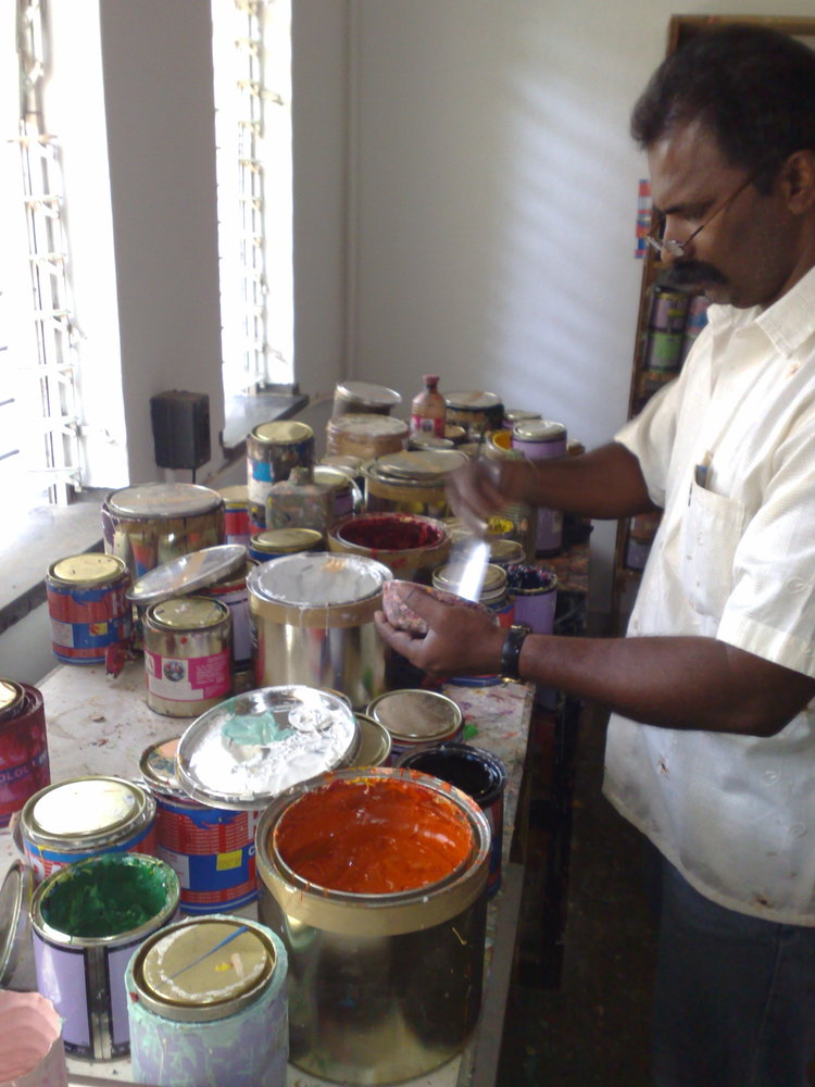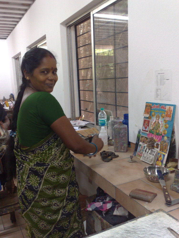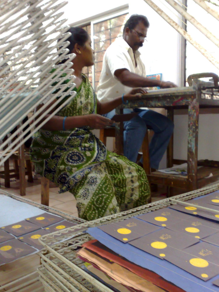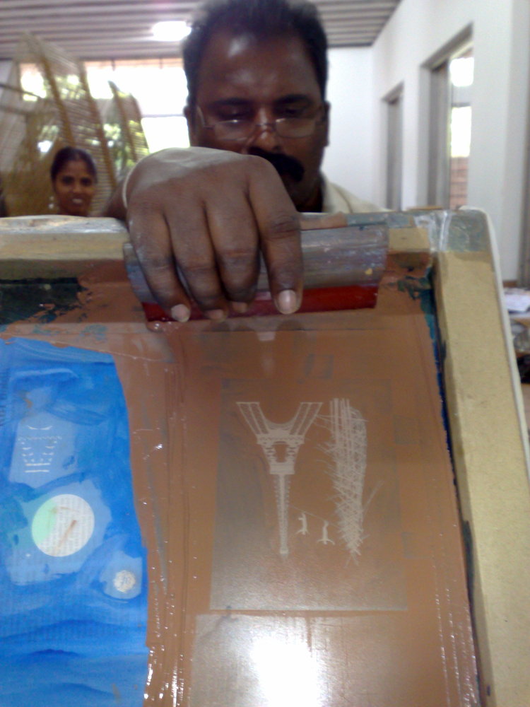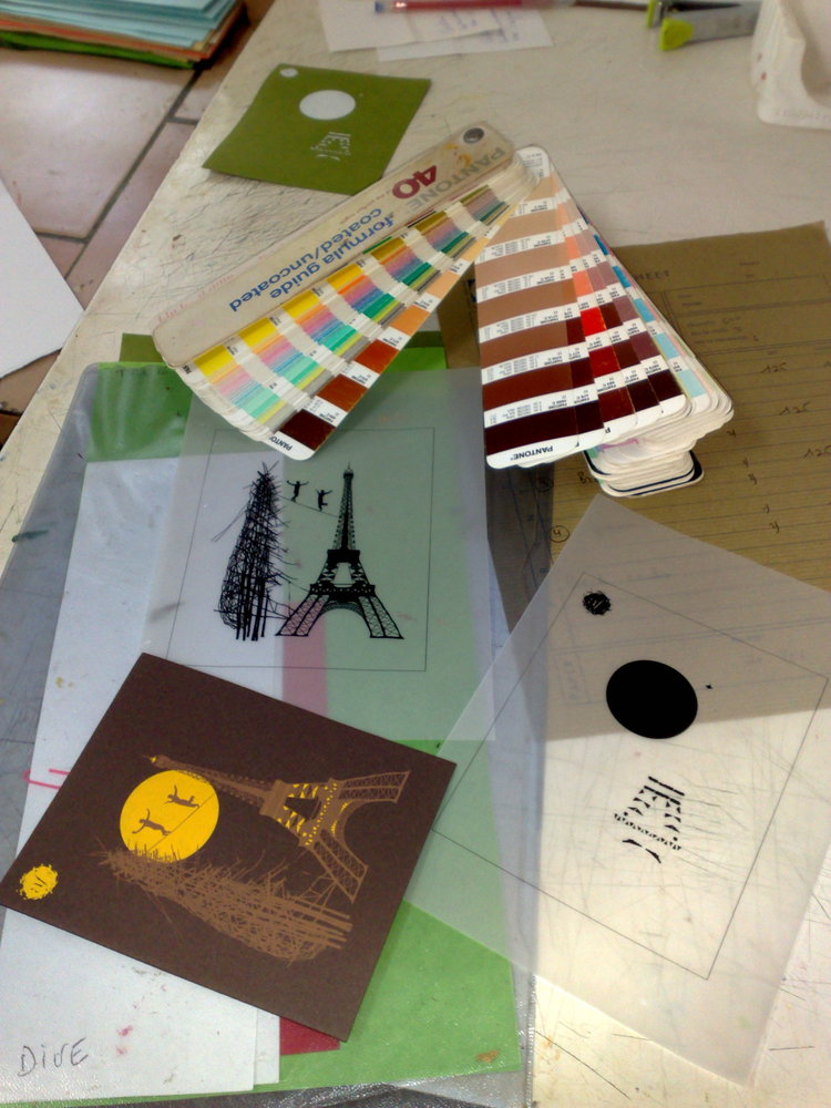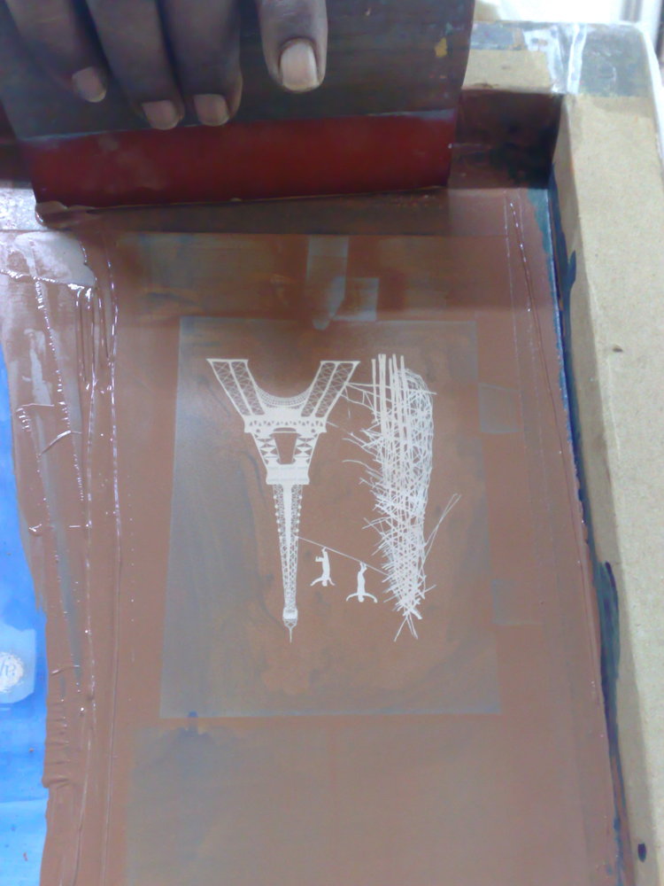 This morning we started the screenprinting of four postcards of the two towers (Vanuatu Gaul tower and French Eiffel tower) at the Lumière workshop in Av. This is the first color combination. Thank you Jayaraman, master screen printer !