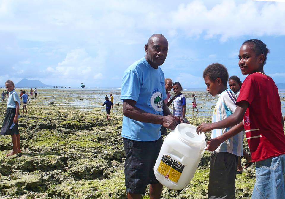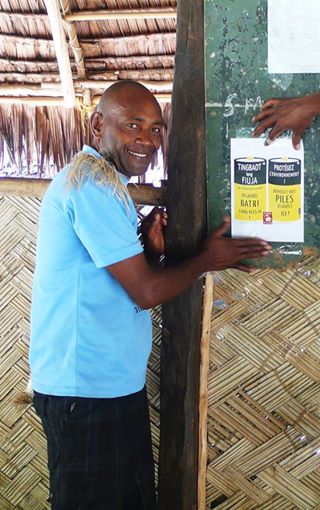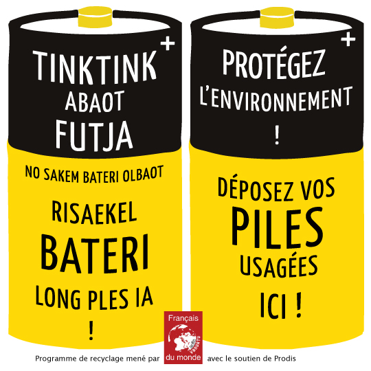 Design du sticker de recyclage des piles au Vanuatu. L’Association Francais du Monde ADFE lance une operation nationale de recuperation des piles. Les photos montrent l’operation sur l’ile de Motalava, une des plus eloignees du Vanuatu et plus précisément dans le village de Neregnimen. Avec le soutien de Edgard Woleg, responsable bénévole de l’annexe de l’Alliance française.