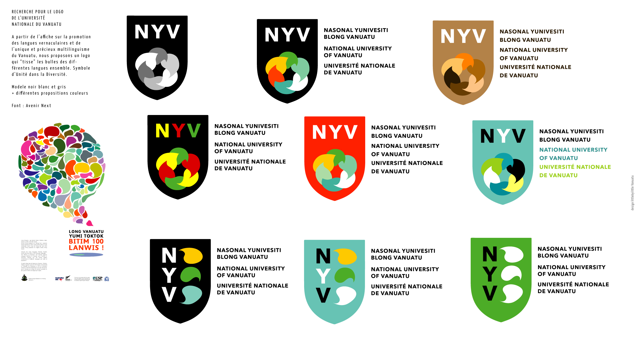 Nasonal Yunivesiti blong Vanuatu / Université Nationale du Vanuatu / National University of Vanuatu is officially open and Littlebylittle Studio is proud to have designed its logo. The Y (of Yunivesiti in bislama) being Vanuatu’s shape on the map, the U (of University / Université) rooting it on the ground and below the six language bubbles of the 6 Provinces with their respective symbols. The idea being that Nasonal Yunivesiti blong Vanuatu / Université Nationale du Vanuatu / National University of Vanuatu will be multilingual and rooted in the linguistic diversity of the country (160 + languages spoken today). Celebrating Unity in Diversity on Vanuatu’s 40th year of Independence.