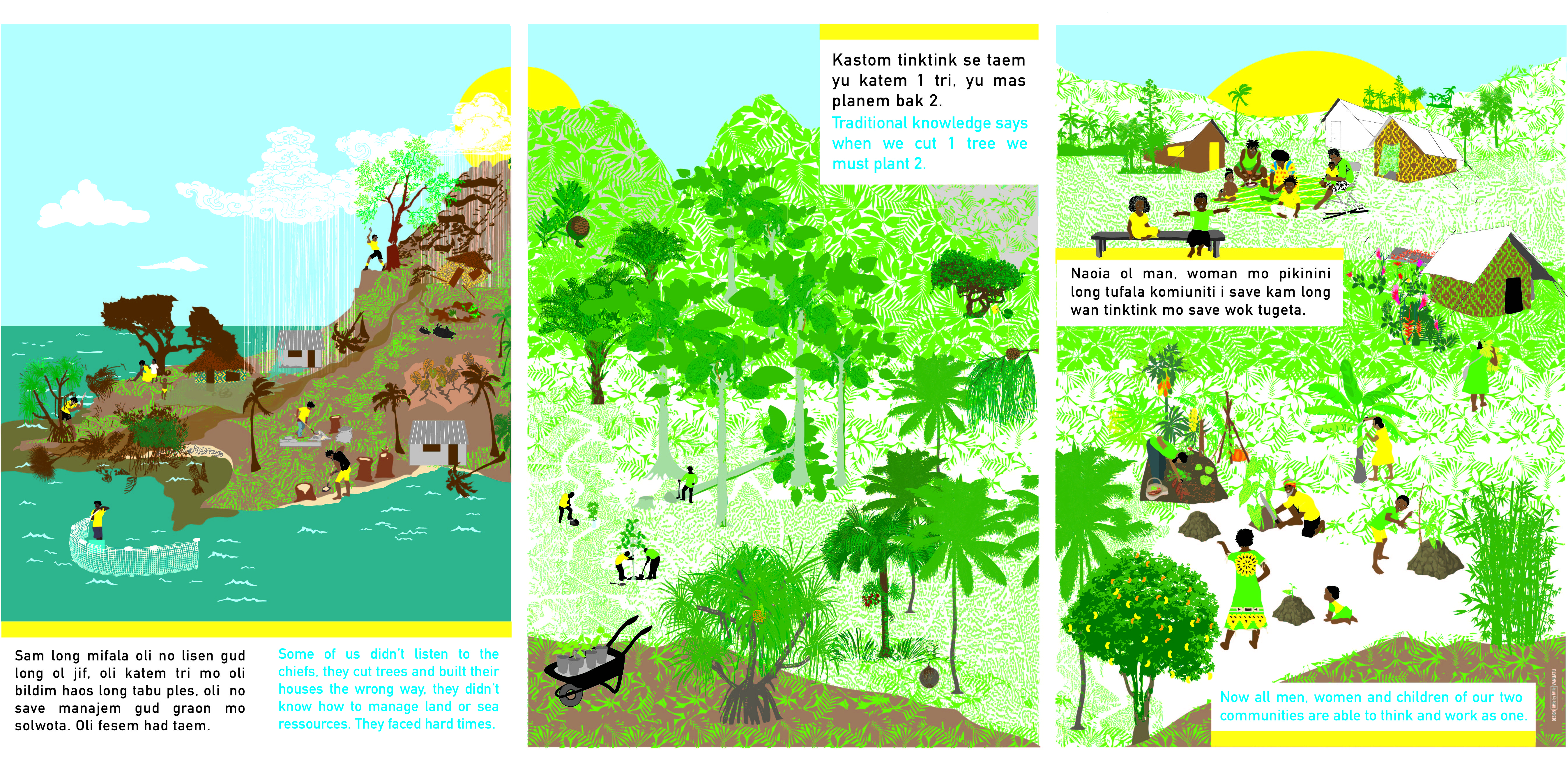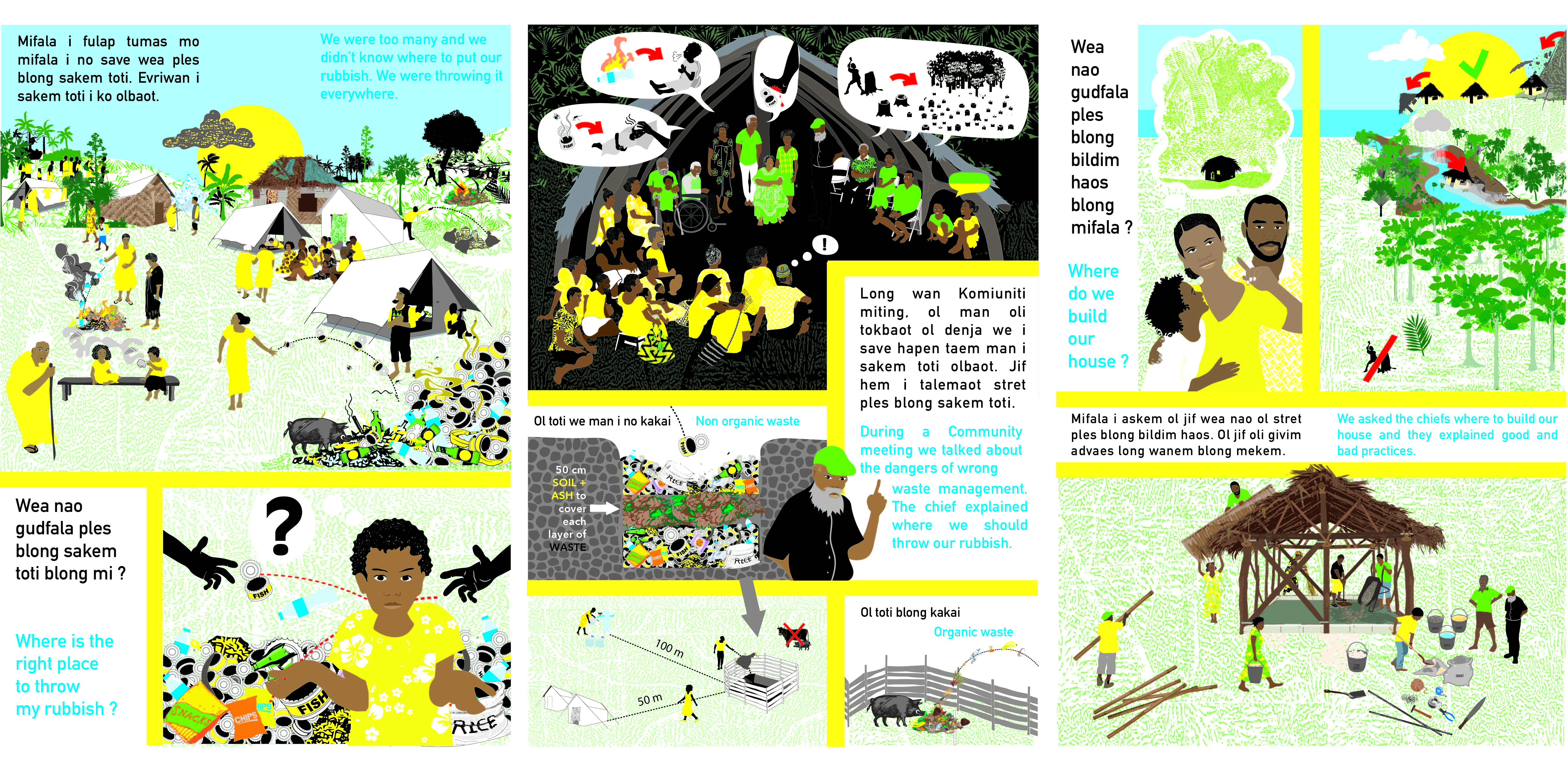 It will be printed on a long banner, rolled up in the backpacks of the facilitators and unfolded in the villages. Easily hung between two trees or in a community nakamal, it will accompany the facilitation, the concerns, questions and answers of any displaced population together with their hosts.
