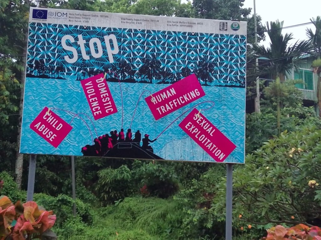 IOM has commissioned Little by little Studio to design a series of large Public Space BILLBOARDS and t-shirts addressing the main issue of Human trafficking and VAWG in the Solomon Islands.