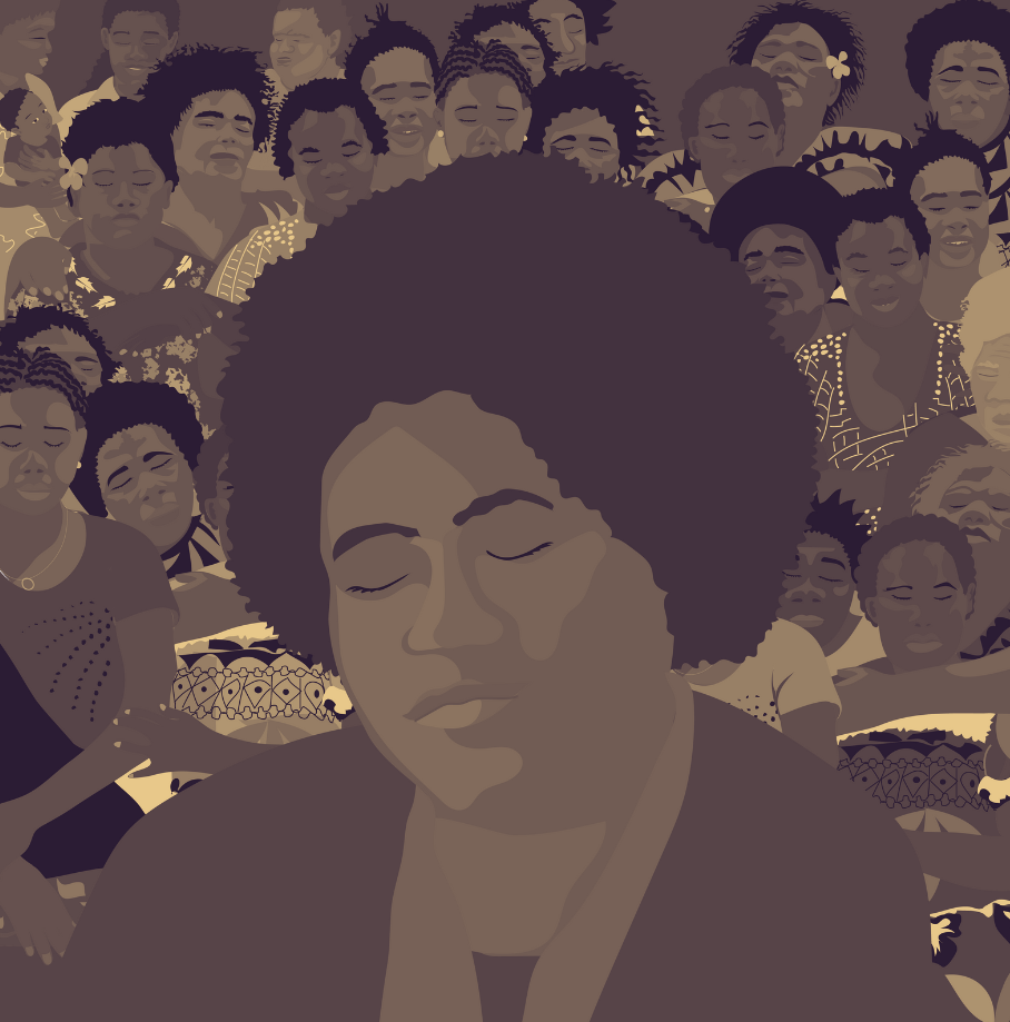 For this drawing, I have surrounded Grace Molisa with supportive women and girls of all ages and in the very simple animation I had them close their eyes together in a common dream for a peaceful future.