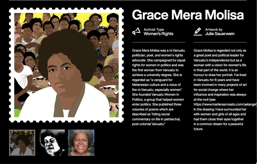 “The stories that permeate our newsfeed have become increasingly dark lately. Abuse, discrimination, oppression, violence, and war are global problems that all countries and people face. In an effort to shine a light on some of the individuals who stand against injustice and advocate for peace, we decided to create a series of digital stamps featuring portraits of these heroes, one for each sovereign nation.”